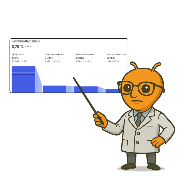 Analysoimme, missä kohtaa asiakkaat putoavat pois ostopolulta. Rakennamme hypoteeseja, toteutamme A/B-testejä ja kehitämme sivustoa jatkuvasti niin, että konversioaste, keskiostos ja asiakkuuden arvo kasvavat. CRO-työ on yhdistelmä UX-suunnittelua, data-analyysiä, myyntistrategiaa sekä vanhaa kunnon etsivätyötä.
